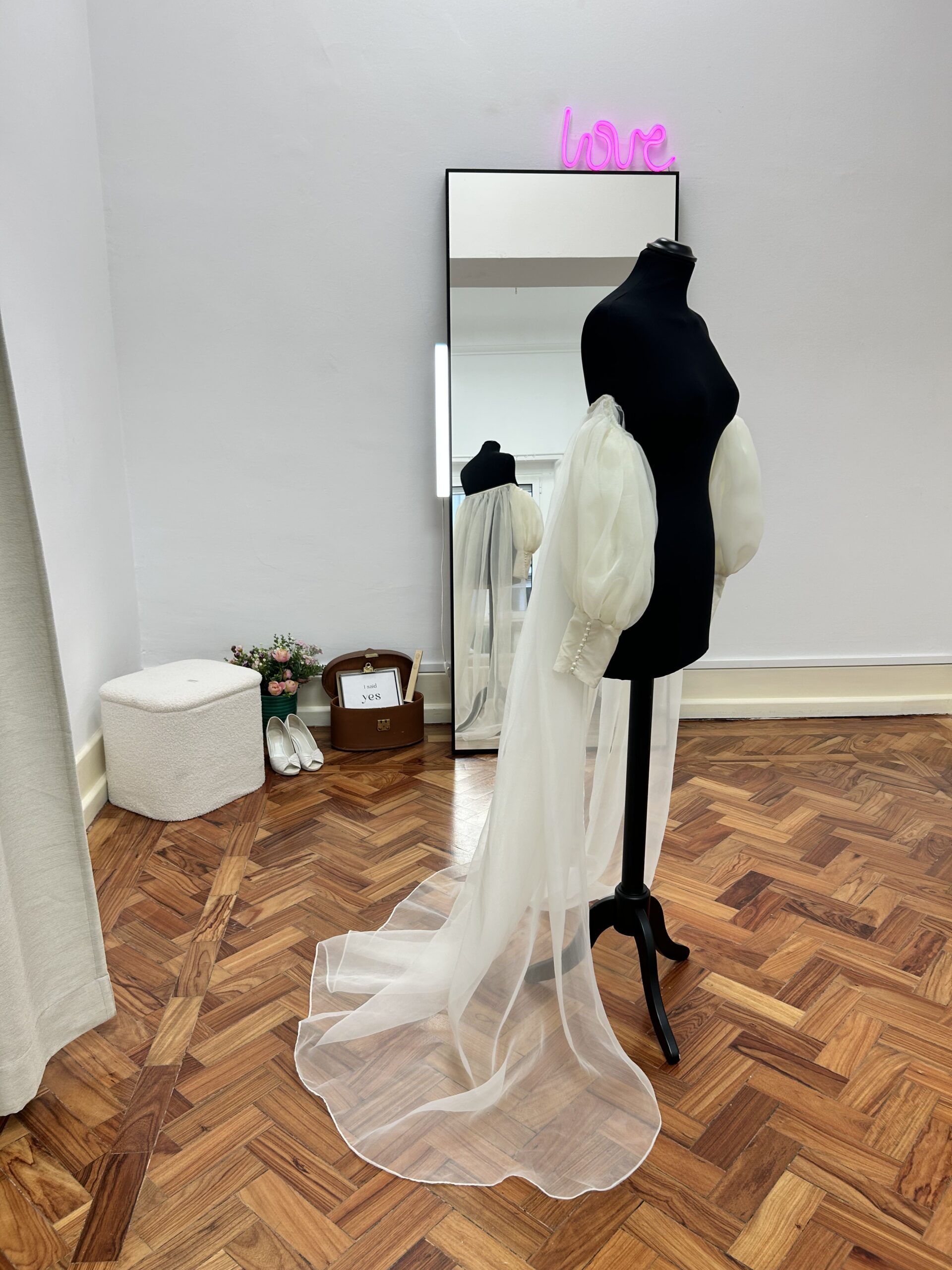 Capa em organza com mangas balão e punhos em tecido mikado com botões pérola.