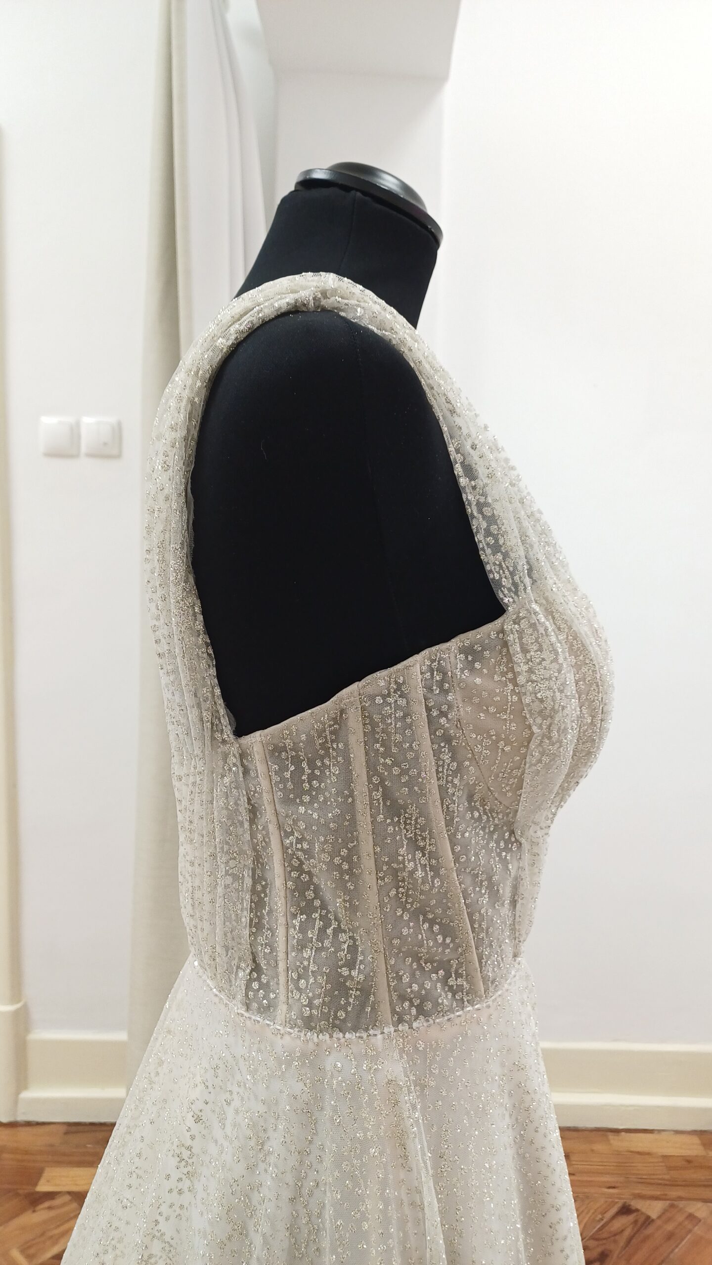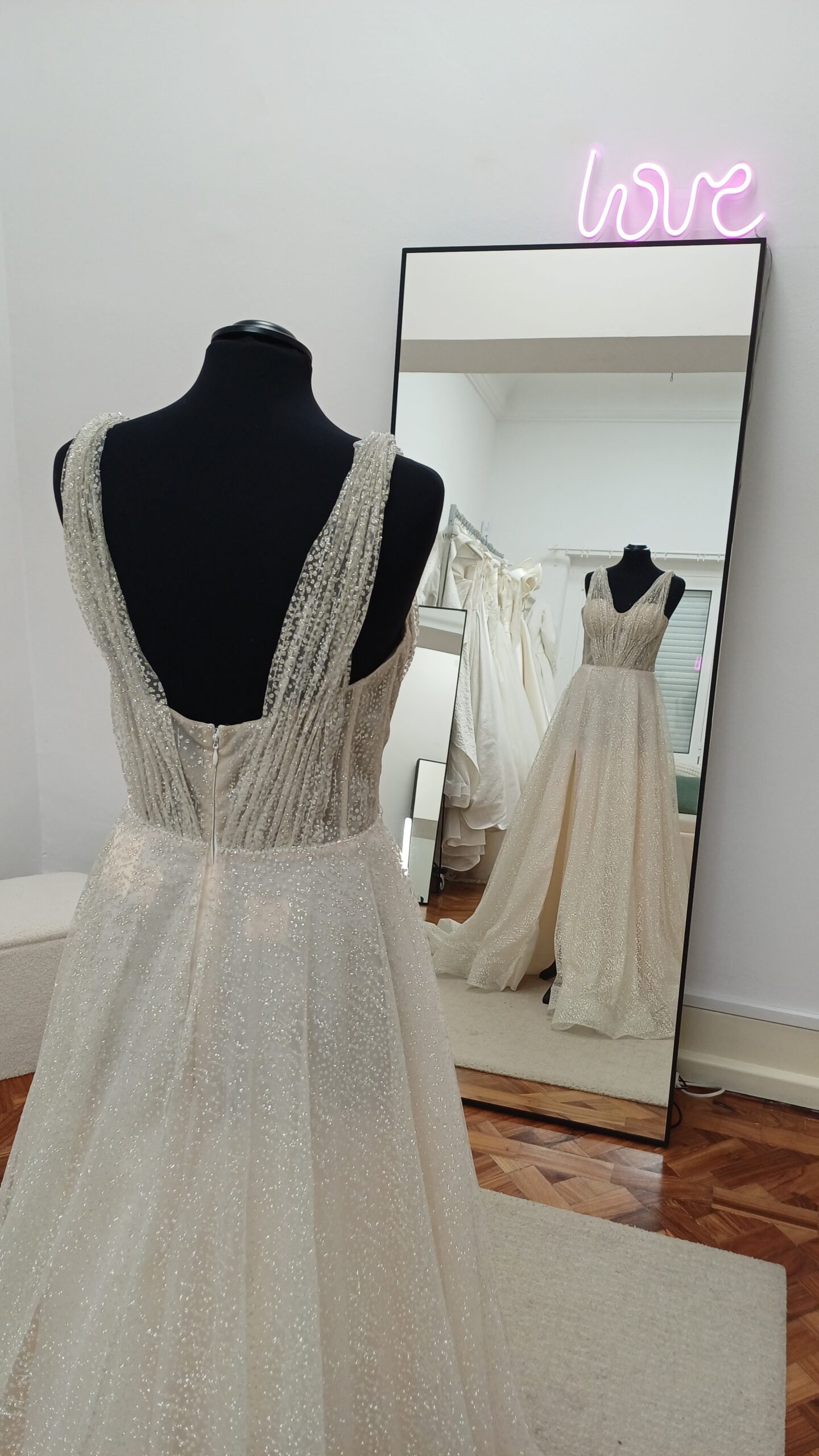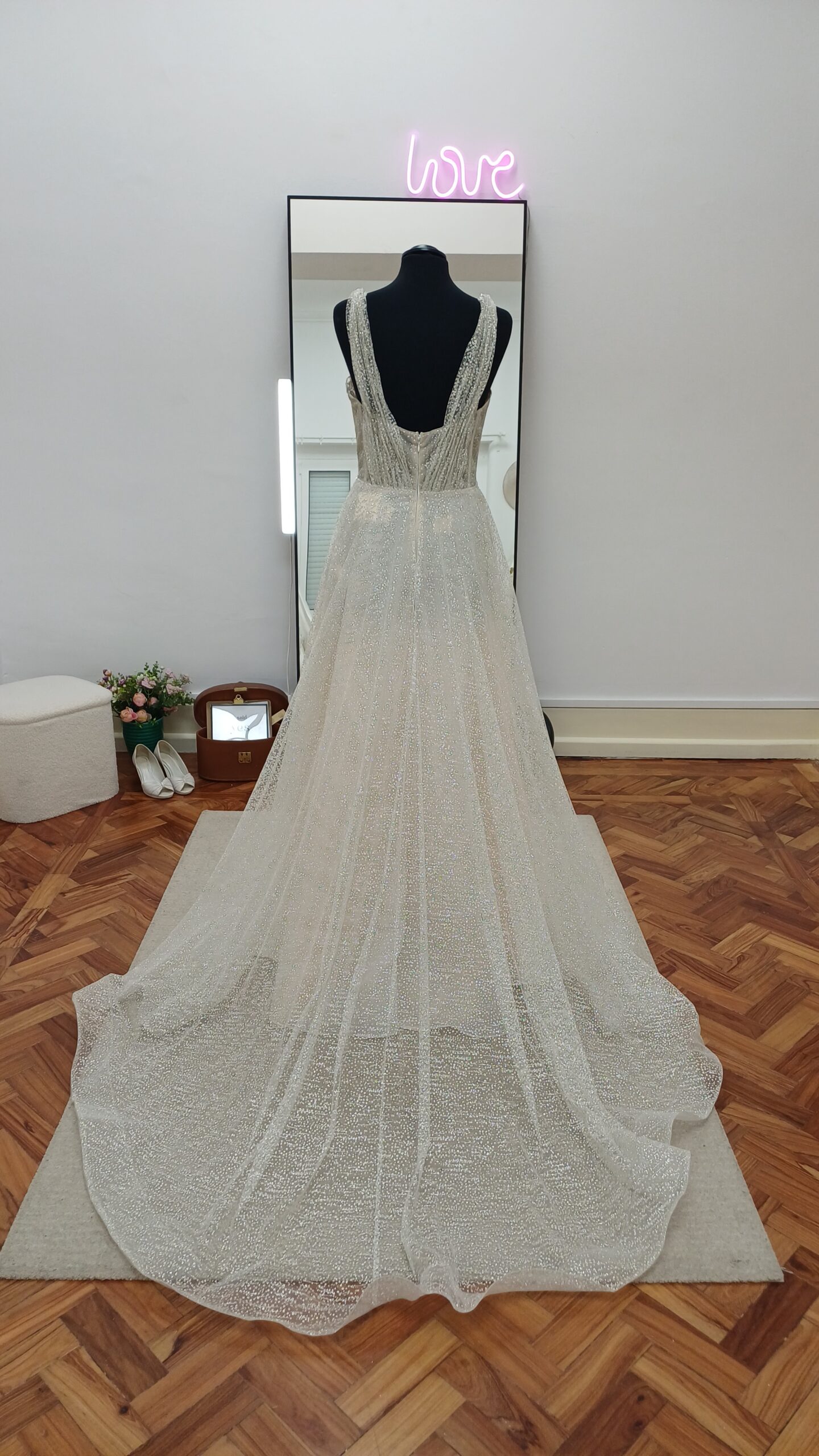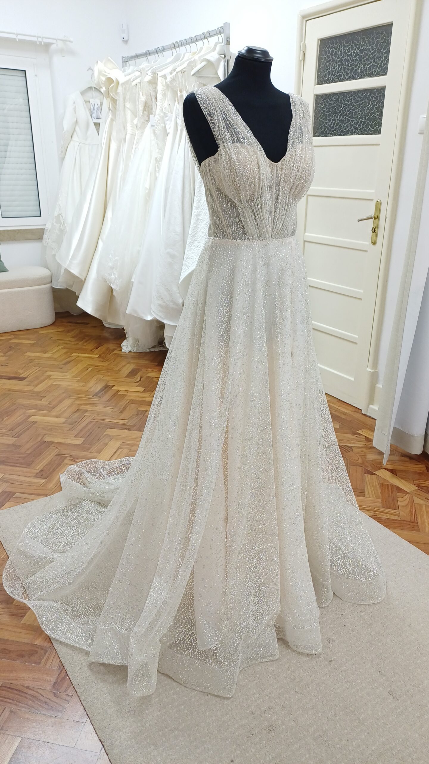 Confecionado em tecido tule com glitter, este vestido leve brilha a cada movimento. O decote em V e o corpete semi-ilusão acrescentam um toque de sensualidade, enquanto a sedutora racha revela a quantidade perfeita de pele. O decote profundo nas costas completa o look, tornando este vestido num arraso de todos os ângulos. Perfeito para a noiva que quer causar impacto no seu dia especial.