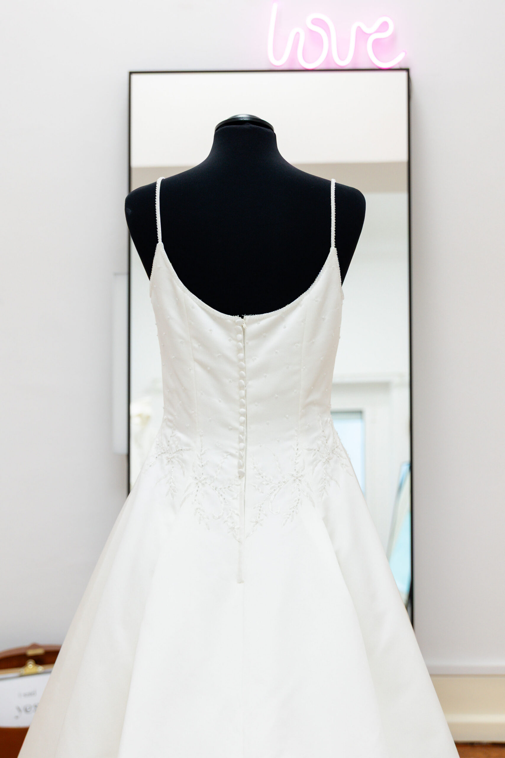 AGENDAR VISITAVestido de noiva vintage com bonitos pormenores de bordado floral e aplicação de missangas na cintura, bainha e cauda. O decote arredondado é enaltecido pelas alças finas, terminando numas costas arredondadas o que dá uma simetria interessante ao vestido. Vestido leve e com elegância clássica, termina numa saia em A com os mesmos detalhes harmonizando e sublinhando a simetria do mesmo.