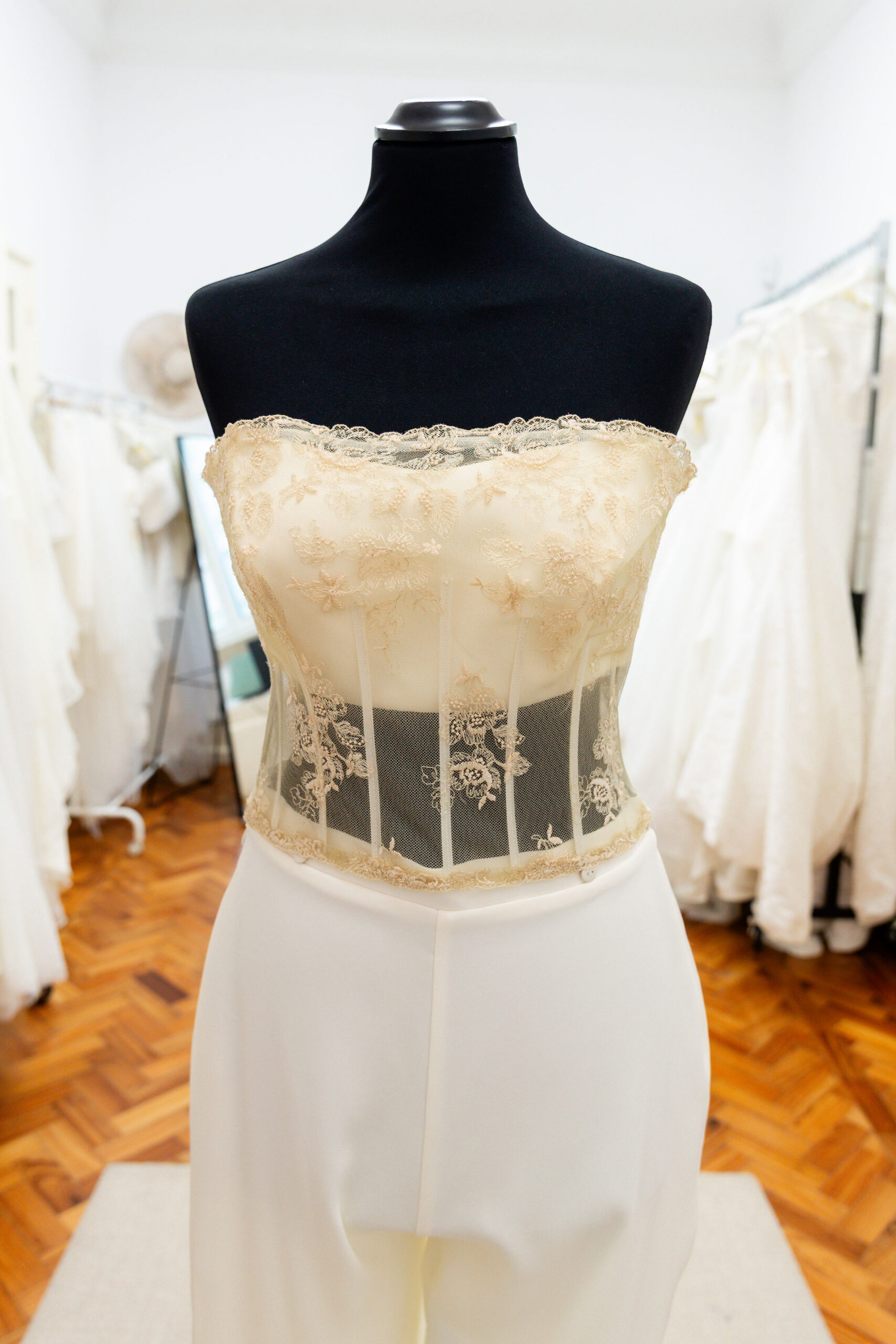 Trata-se de um corpete sem alças, com corte cai cai, que envolve o tronco de forma estruturada. É confeccionado em renda fina e tecido translúcido, permitindo ver subtilmente as barras verticais, que definem a cintura e dão suporte ao corpo, criando uma silhueta elegante e feminina.