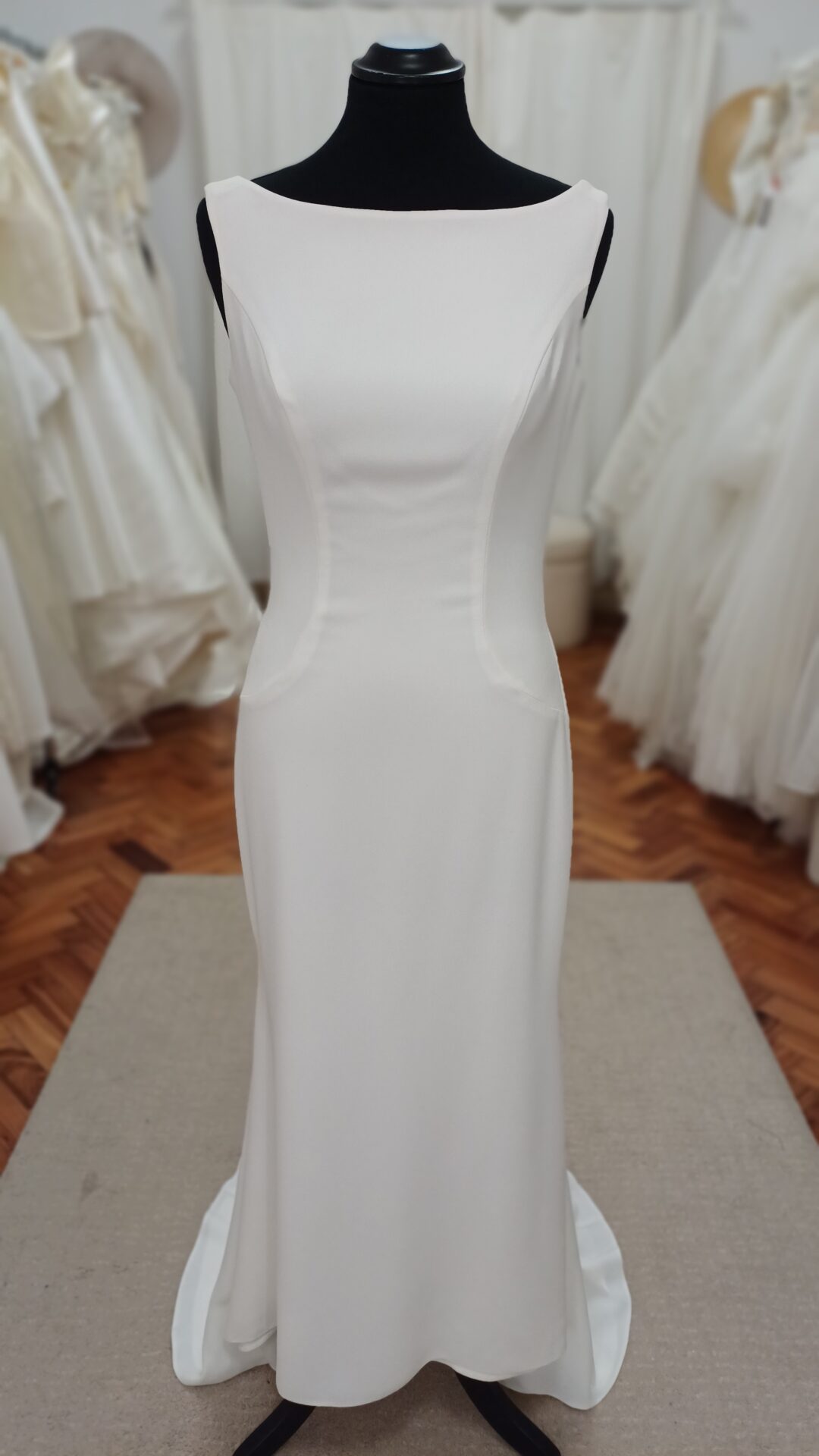 Feito em crepe de alta qualidade, o vestido apresenta um decote barco clássico, que destaca os ombros de forma delicada e requintada. O corte justo realça a silhueta com discrição, enquanto a cauda assimétrica e midi adiciona um toque moderno, evidenciando os sapatos e conferindo movimento ao visual.