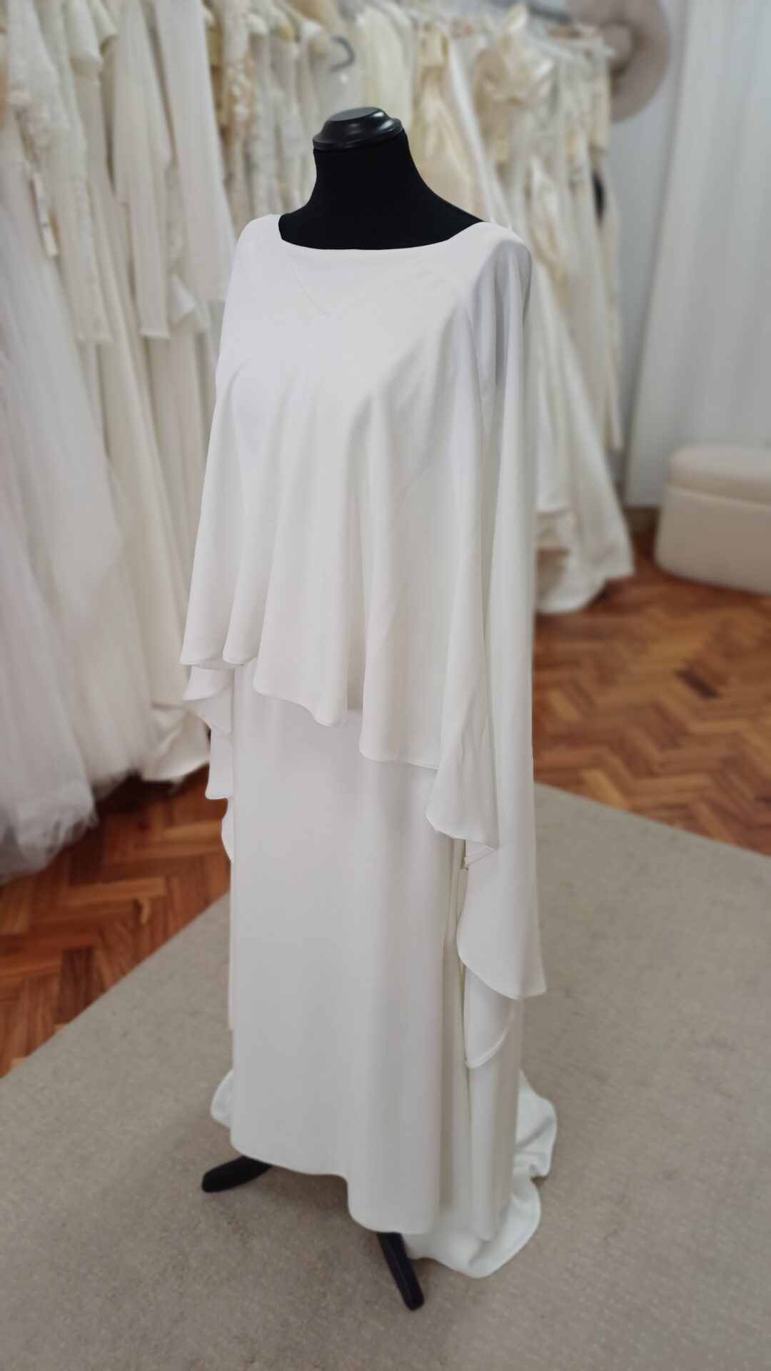 Para completar, o vestido inclui uma capa deslumbrante que eleva o look com um ar de majestade e contemporaneidade.