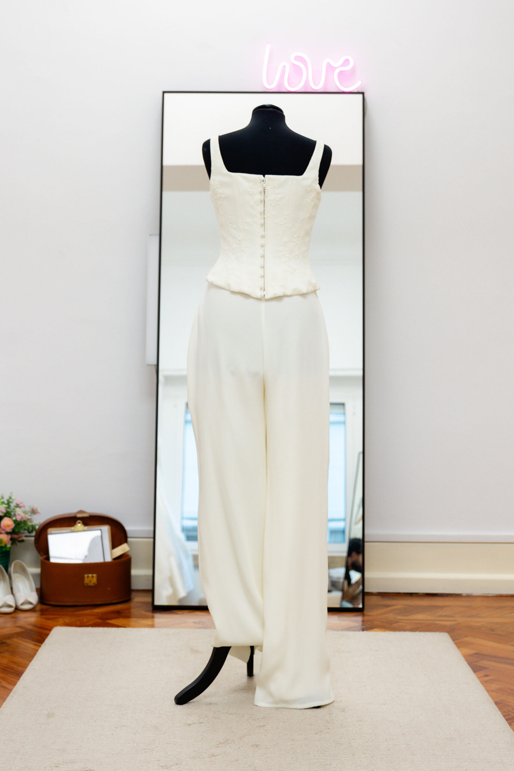No conjunto, é um top leve e muito feminino, ideal para um look de noiva moderno que combina tradição e contemporaneidade, especialmente quando usado com calças de cintura alta.