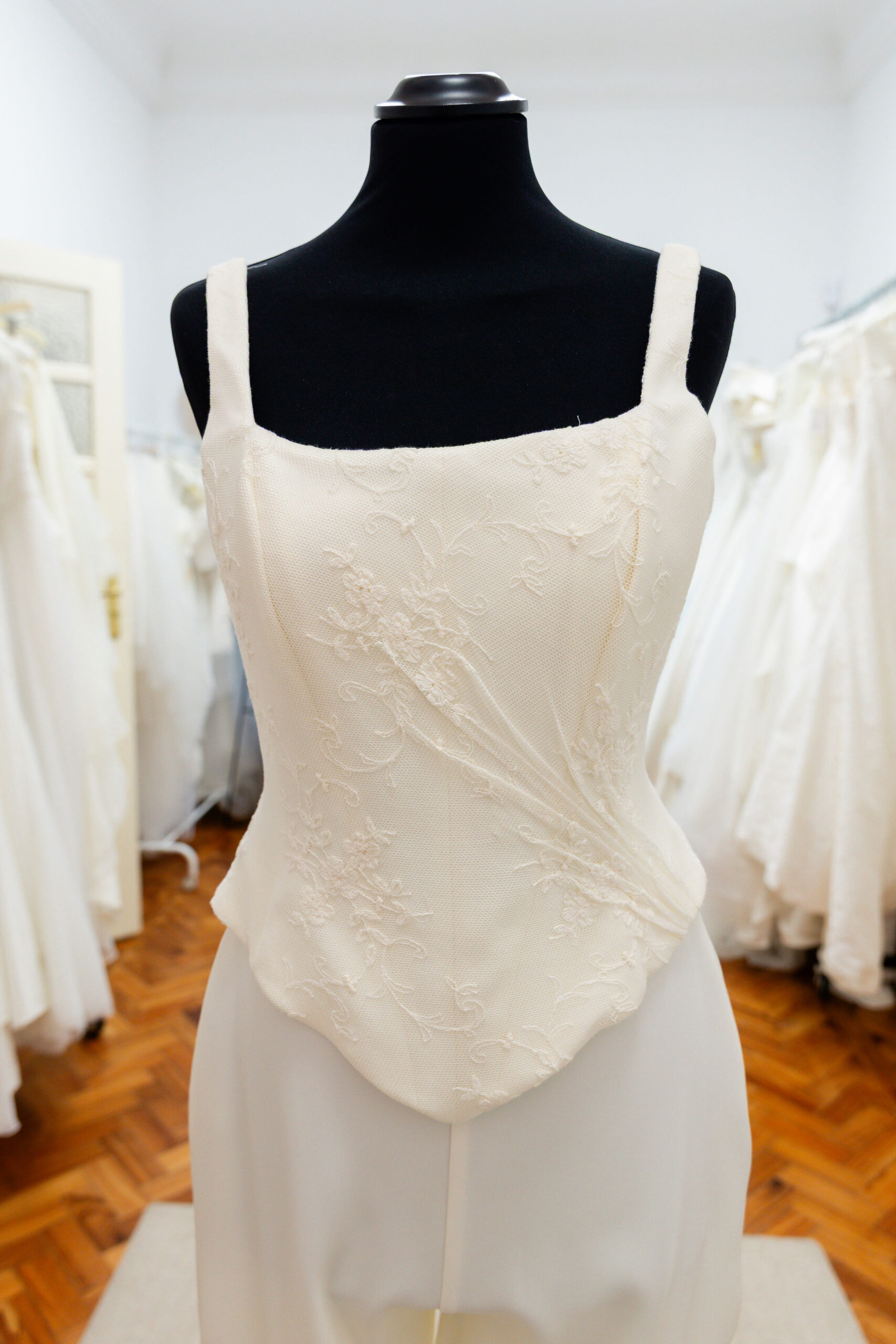 Trata-se de um corpete com alças grossas, confeccionado em renda fina e com desenhos florais, criando uma silhueta elegante e feminina. A renda apresenta motivos florais discretos, reforçando o caráter romântico e artesanal da peça. Na parte de trás, tem um fecho com pequenos botões, um detalhe clássico e sofisticado.